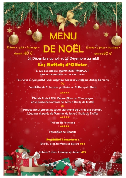 L'équipe du restaurant vous propose son menu de Noël valable le 24 décembre au soir et le 25 décembre à midi !